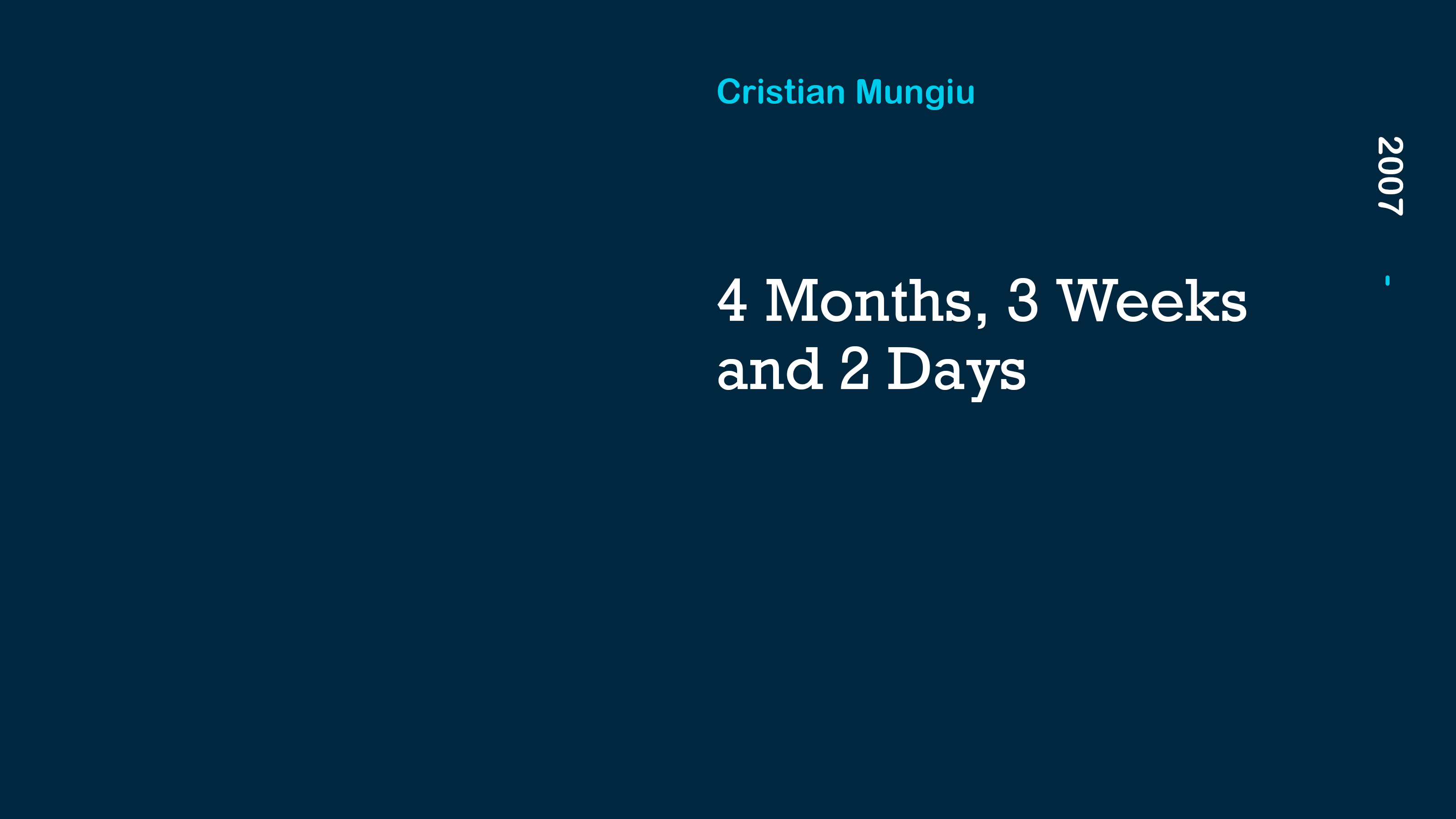 Romania, 1987, the brutal Ceausescu communist regime is in place; birth control is illegal and abortion is a crime punishable by death. Gabita (Laura Vasliu) is almost five months into an unwanted pregnancy and in meek desperation turns to her friend and roommate, Otilia (Anamaria Marinca) for help in organizing an illegal termination. Unfortunate circumstances force the two women to use an unwanted male abortionist, Bebe (Vlad Ivanov). The bleakness of the storyline expresses a dark socio-political critique in the twilight years of a repressive dictatorship.