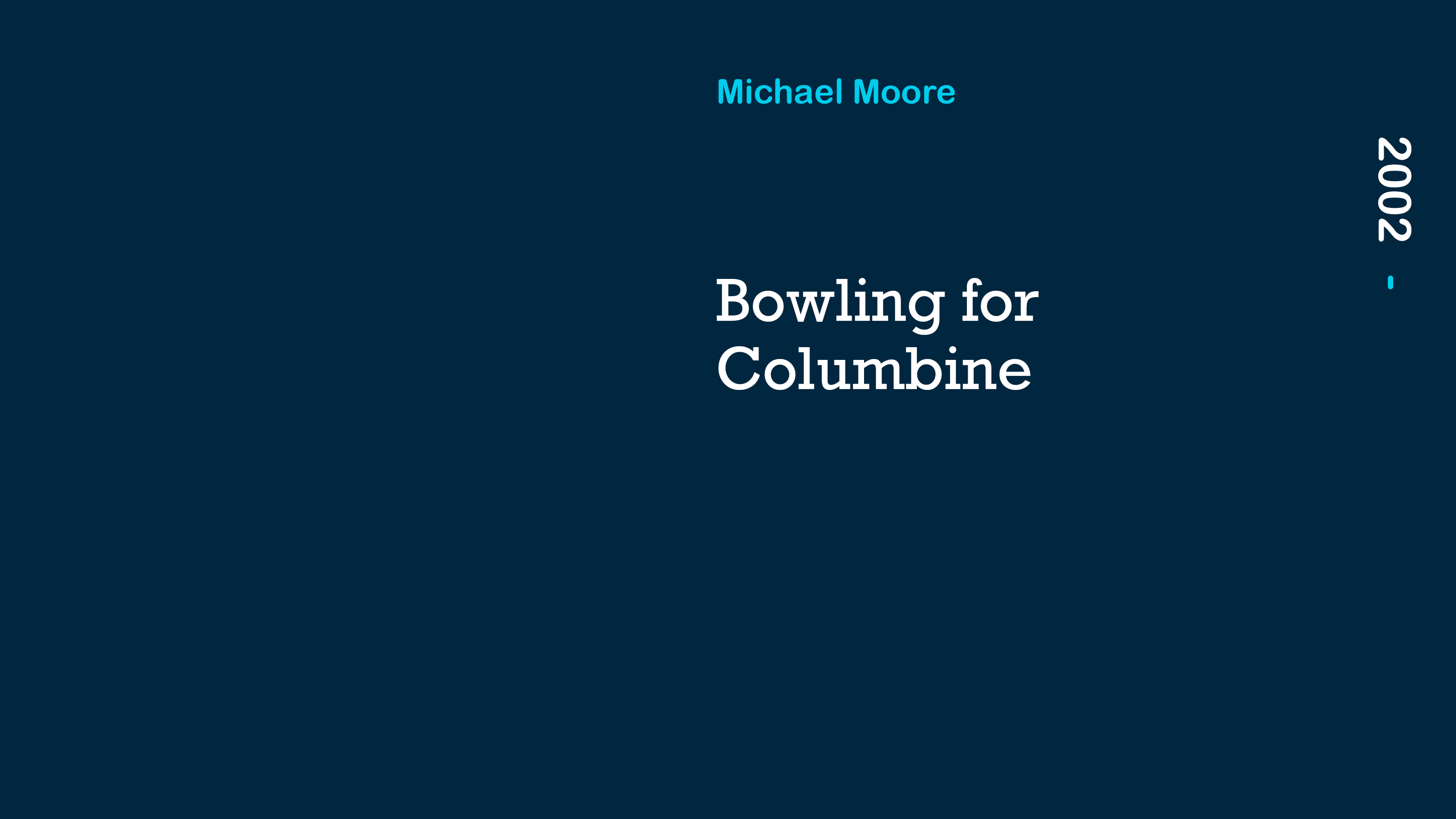This is not a film about gun control. It is a film about the fearful heart and soul of the United States, and the 280 million Americans lucky enough to have the right to a constitutionally protected Uzi. From a look at the Columbine High School security camera tapes to the home of Oscar-winning NRA President Charlton Heston, from a young man who makes homemade napalm with The Anarchist’s Cookbook to the murder of a six-year-old girl by another six-year-old. Bowling for Columbine is a journey through the US, through our past, hoping to discover why our pursuit of happiness is so riddled with violence.