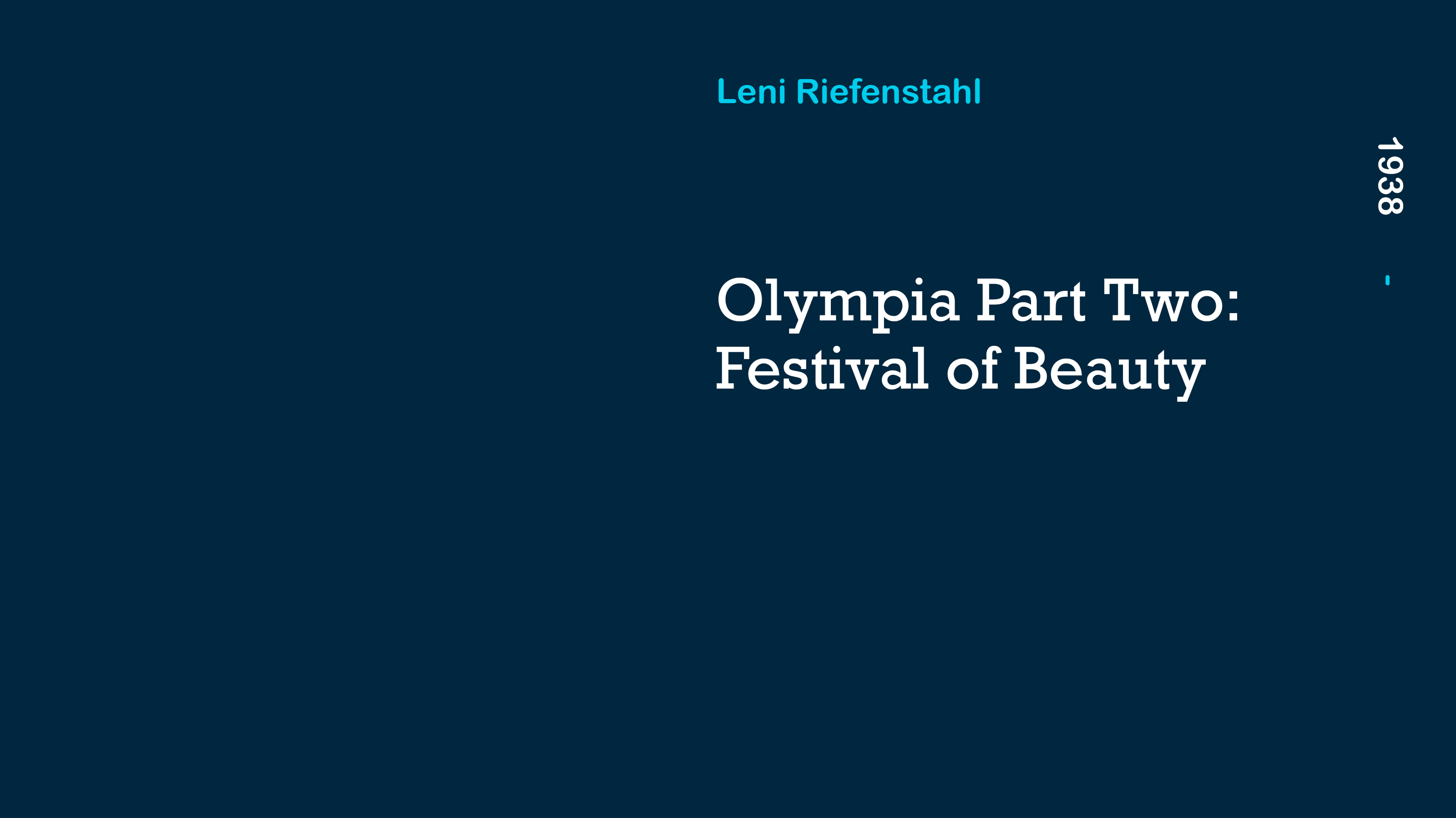 Part two of Leni Riefenstahl’s monumental examination of the 1938 Olympic Games, the cameras leave the main stadium and venture into the many halls and fields deployed for such sports as fencing, polo, cycling, and the modern pentathlon, which was won by American Glenn Morris.